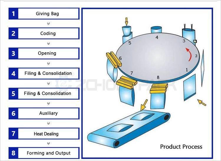 | Work flow | Giving bag→Coding→Opening bag(or Open zipper bag)→Filling→ Auxiliary→Exhaust→Heat sealing→Forming and output products. | ||